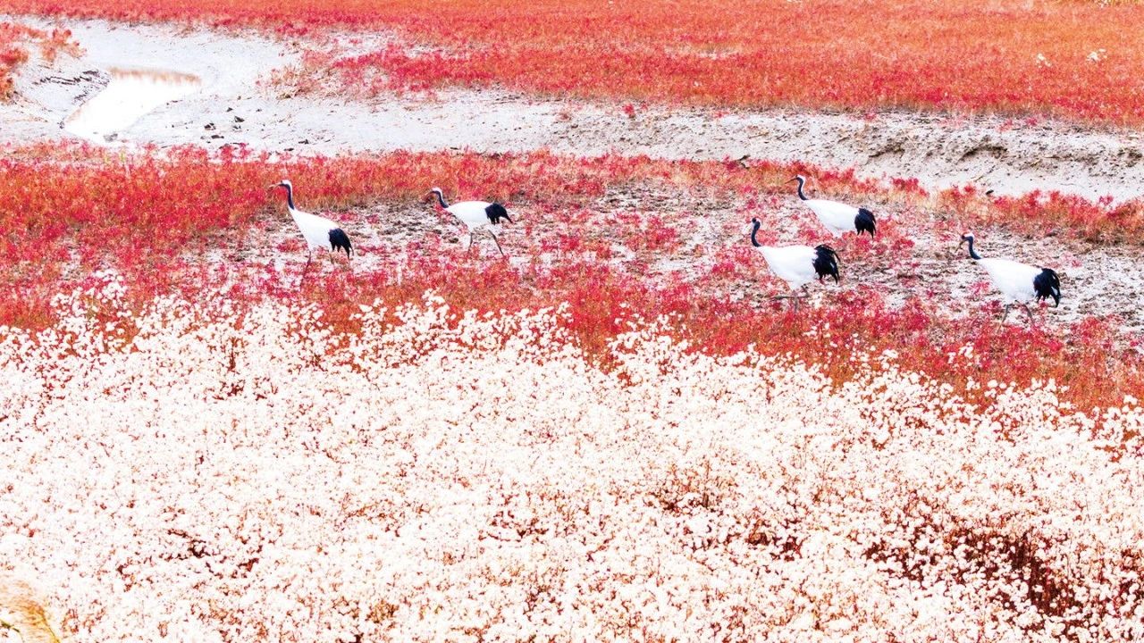![]() 丹顶鹤惬意地漫步在红海滩 盘锦位于渤海之滨、辽河入海口、中国最北海岸线,湿地面积达2496平方公里,占全市总面积的61.45%,分布着各类野生动物494种、野生植物275种,其中鸟类有321种。每年秋季,碱蓬草逐渐变红,形成一片壮丽的红色海洋,大片的芦苇荡和金色的稻田与之相辉映,美不胜收,吸引了大量摄影人前来拍摄。 ![]() 鸟儿们在滩涂休憩觅食