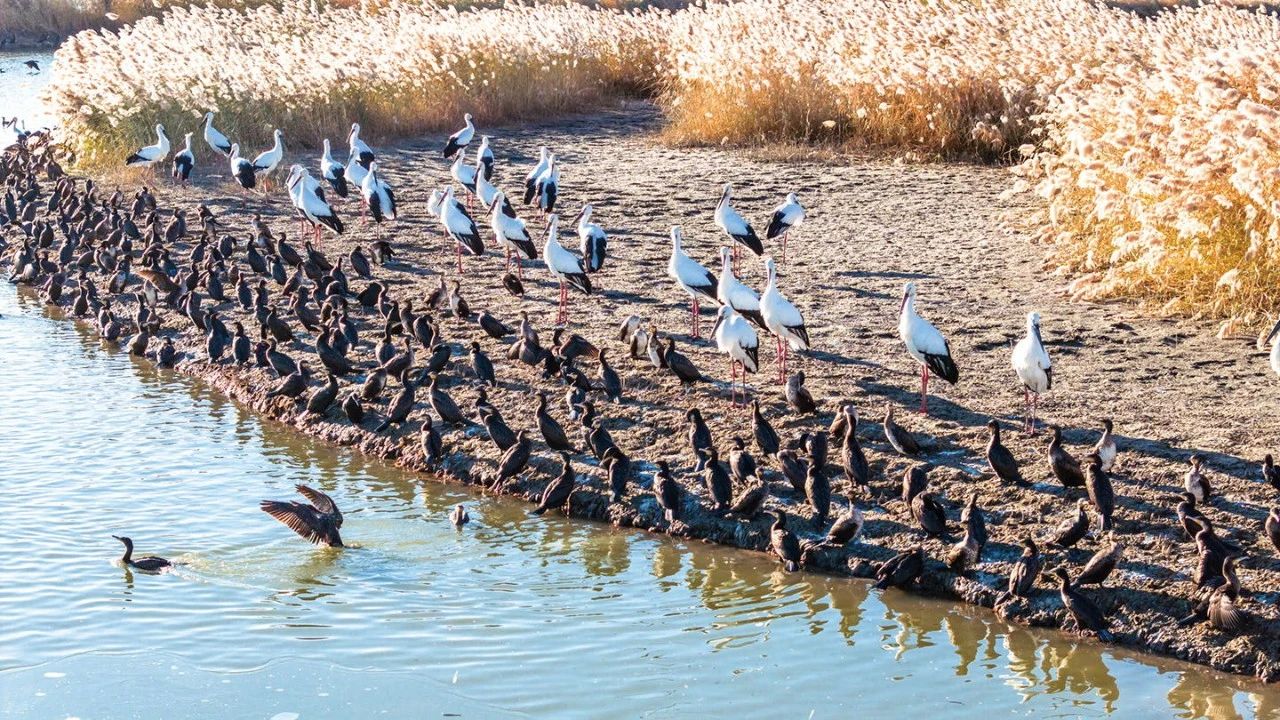 辽河口湿地作为东亚——澳大利西亚候鸟迁飞通道的中转站,每年秋季,候鸟迁徙到盘锦的时间主要集中在10月到11月之间。具体来说,从10月起,迁徙鸟类数量开始明显增多,到11月中旬达到高峰。这段时间,鹤鹳类、雁鸭类等大型候鸟陆续迁至辽宁辽河口国家级自然保护区,主要停歇在保护区的芦苇沼泽水域、河口滩涂、河流水库等区域。