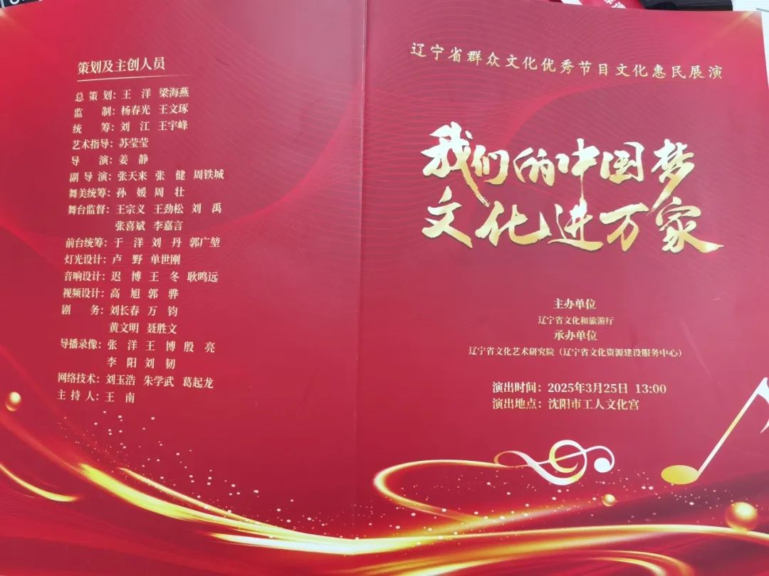 2025年3月25日,由辽宁省文化和旅游厅主办,辽宁省文化艺术研究院(辽宁省文化资源建设服务中心)承办的“我们的中国梦 文化进万家”辽宁省优秀群众文化节目惠民展演活动在沈阳市工人文化宫成功举办。