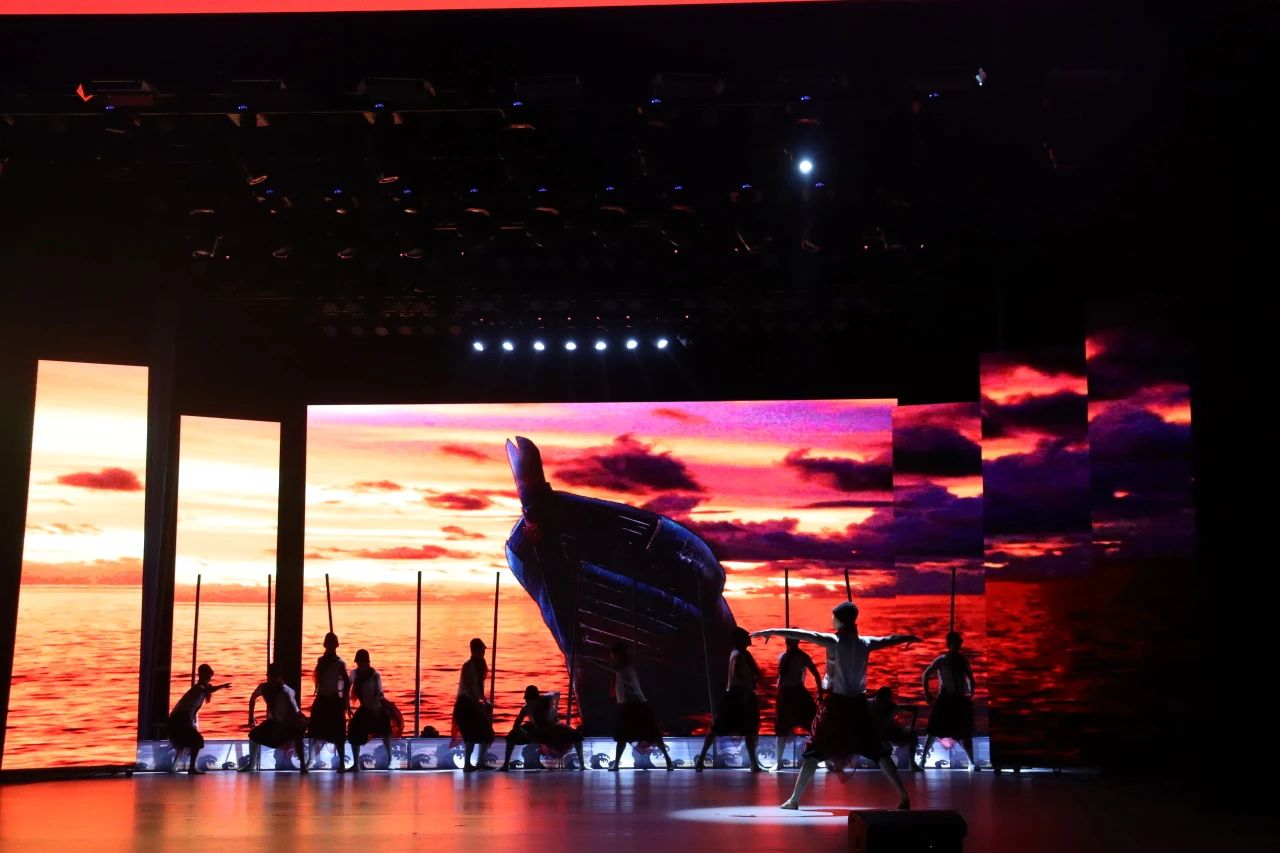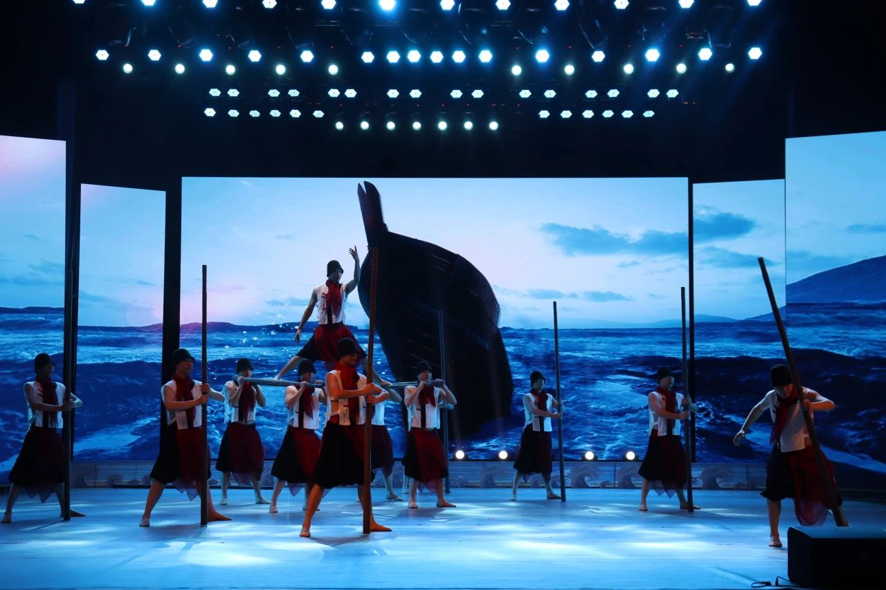 盘锦的辽河口二界沟地区有一种捕鱼的方式叫“樯张网”。樯张网是海上为数不多的“有腿网具”之一,将三丈有余的樯桩按一丈的间距布置于浅海区,樯桩之间布置渔网,于潮涨潮落之间截获鱼虾。舞蹈创意选取的素材是搭樯中的一部分跳樯元素,通过渔民跳樯下网时得劳作来体现渔民对美好生活的向往和热爱,市级非遗二界沟渔家号子的吟唱高亢有力,号子唱出动作随声附和,号子上扬跳樯加力,这样一唱一动,此起披伏的劳动场面蔚为壮观。一片辽河口渔业兴盛时期的景象完美呈现。