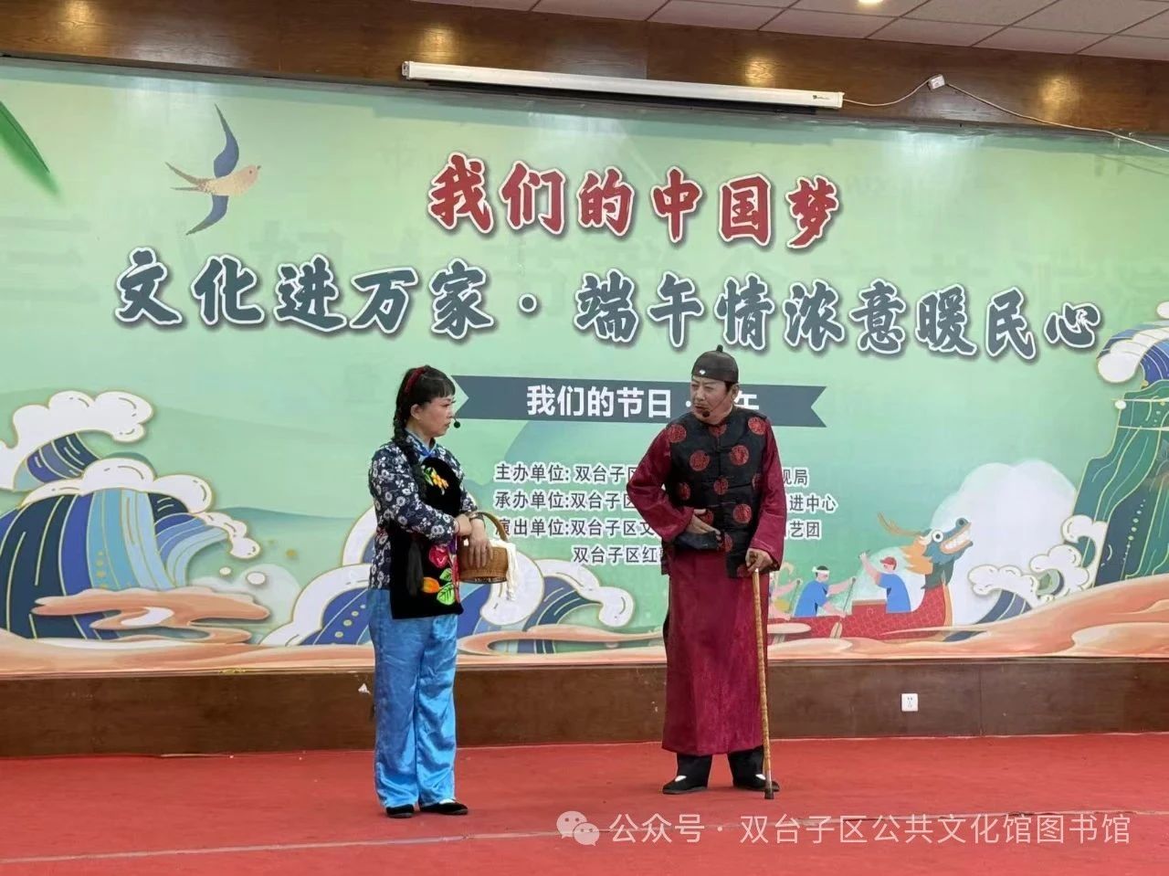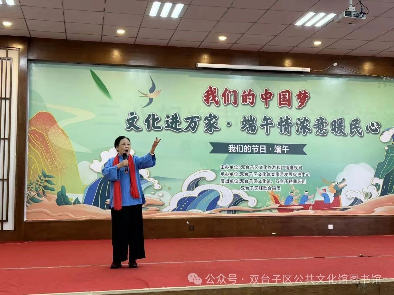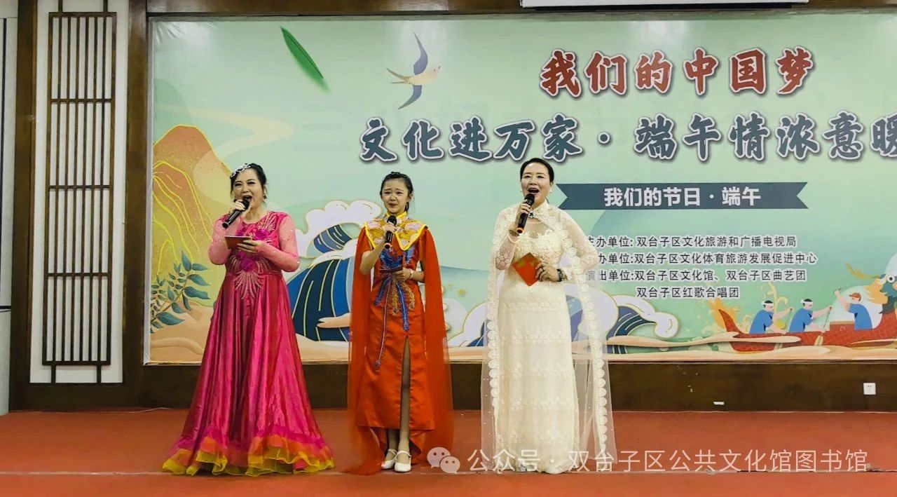 5月30日下午,由双台子区文化旅游和广播电视局主办,双台子区文化体育旅游发展促进中心承办,双台子区文化馆、双台子区曲艺团、双台子区红歌合唱团共同演出的 “我们的中国梦 —— 文化进万家・端午情浓意暖民心” 惠民演出,在区文化馆多功能厅圆满落幕。此次活动吸引众多居民到场,为基层群众献上精彩的端午文化盛宴。