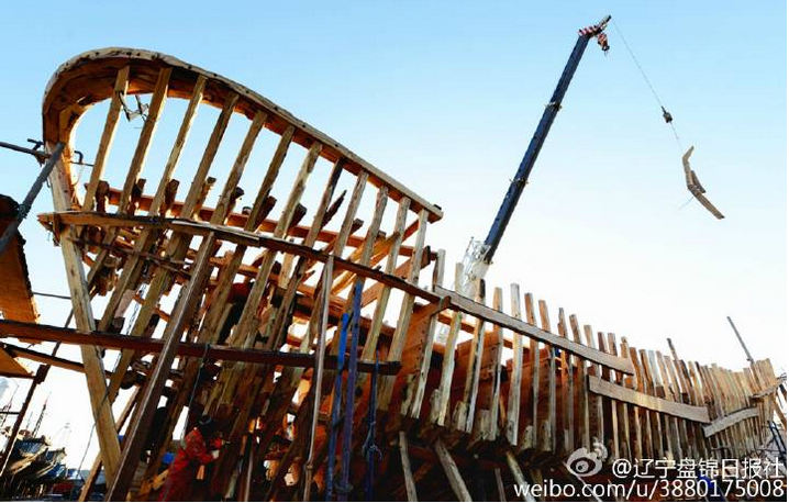 张明在《辽东湾渔猎文明的遗存》一文中记载:一艘船最底下、最厚的木料就是龙骨,所有的构件要安放在上面,船的牢固程度,龙骨起到决定性因素。因龙骨是用斧子纯手工砍成,也叫砍龙骨。就是用斧子把三根的大料砍出形状并连接。砍之前要在龙骨的前、中、后端正中,用铜钱儿钉一块红布。动工当天,掌作心怀崇敬,动斧砍木,之后鸣放鞭炮。工人们才开始动手。炮竹响,才是排船的真正开始。最隆重的仪式是安装“大鼻子”。“大鼻子”就是首柱,因其恰如大象伸直的鼻子,被人称作“大鼻子”。 大鼻子有足够的强度,能承受各种外力冲击,关键的时候还可以保船平安。在安装“大鼻子”之时,表明船主体已完工。当天现场,聚集了船主的亲朋好友,掌作、水作、工夫等众人,如同陆地盖房上梁一样隆重。掌作亲自把一块红布、五色线用铜钱儿钉在大鼻子锚道下面中间的地方,红布团花挂在大鼻子的顶端,也叫挂红。之后,由吊车将大鼻子立起来。鸣放鞭炮后,船主会给水作、捻工等发红包。 船排成了,下坞前还要举行仪式。这个仪式首要是祭海感恩,因渔民从海洋中获取,从内心表达崇拜之意。其次是庆祝。水作、旱作、铁匠、捻匠等被船主请聚一块儿,一顿吃喝。有船主对掌作、水作、旱作、铁匠、捻匠们的感谢,也是图个热闹,讨个吉利,大家一起祈福新排的船能平安顺利,鱼虾满仓。有的新船下水要贴对联:船艏贴的是“龙头金角安天下”“虎口银牙定太平”,横批是“太公在此别无禁忌”,船楼上贴“船头压浪行千里”、“ 舵后生风送九洲” 、横批 “满蓬风顺”;船艄贴“江湖河海清波浪”、“通达逍遥远近游”;船舵杆上贴一方联,只一个字:“灵”!下水前,船舱放着用红纸包着两块砖头,寓意装满“金砖”,砖在古代渔猎中曾用作网坠。然后,在鞭炮声中大船顺着水流迅速滑到河里,一条船才最终排成了。