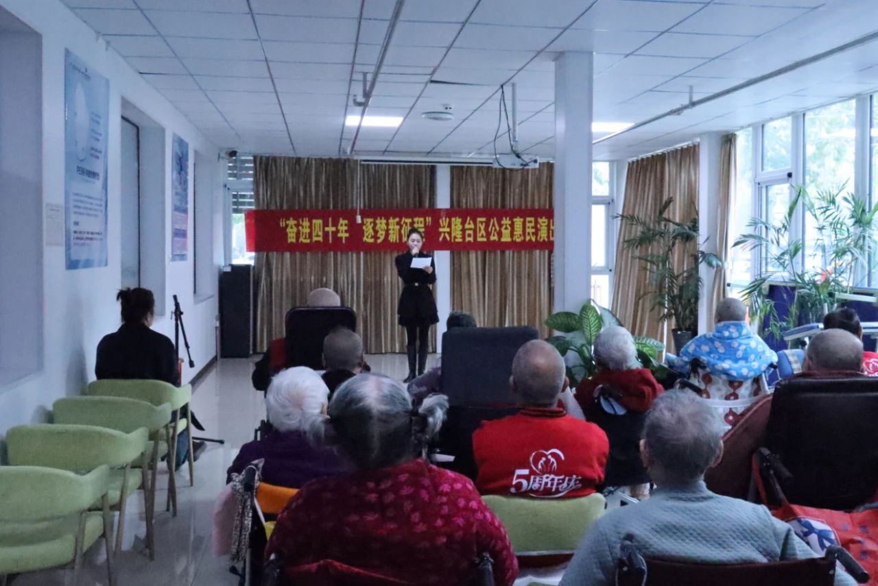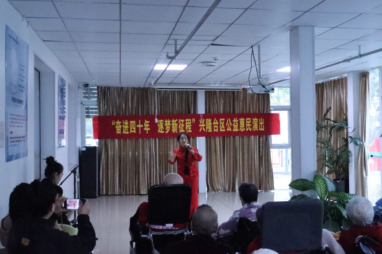 “奋进四十年 逐梦新征程”兴隆台区公益文化惠民演出在胜利社区乐居康养中心举办,活动由兴隆台区民政局、兴隆台区文化和旅游发展服务中心主办;由兴隆台区文化馆、胜利社区乐居康养中心承办。通过群众喜闻乐见的文艺节目,反映新时代火热生活的作品,反映社情民意、和谐大家庭的优秀节目。把党和政府对群众的关怀通过文艺演出的形式送到群众当中,让群众感受的美好生活的幸福感。