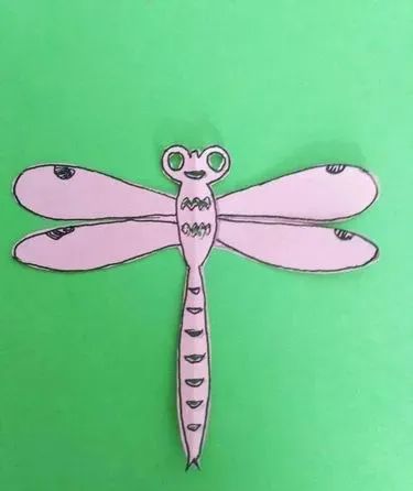 然后跟着老师在彩纸上用铅笔画出蜻蜓的轮廓和花纹