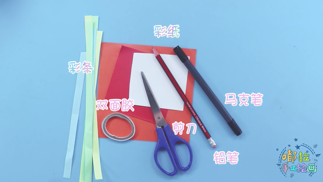我们所需的材材料:彩纸,彩条,马克笔,铅笔,剪刀,双面胶