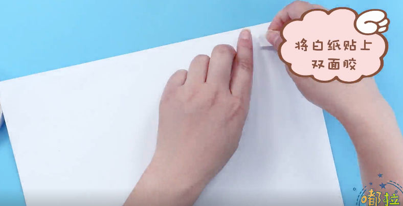 4、准备白色卡纸,粘上双面胶。然后将做好的贺卡贴在白纸上。